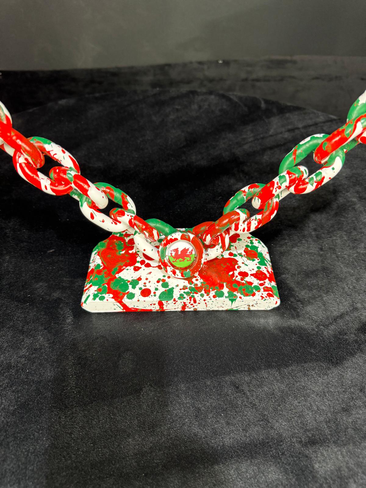 Repurposed lifting chain fashioned into a heart on a metal base painted in Welsh colours, adorned with a Welsh badge and powder coated clear.
